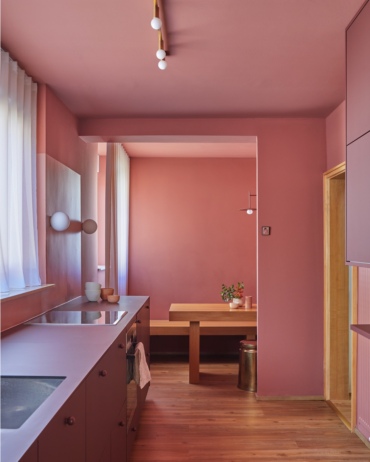 Der rosige Lachston wird von hellem Holz sozusagen auf den Boden geholt Das heißt es wirkt dadurch nicht zu intensiv und wird außerdem veredelt Alles von Constanze Ladner