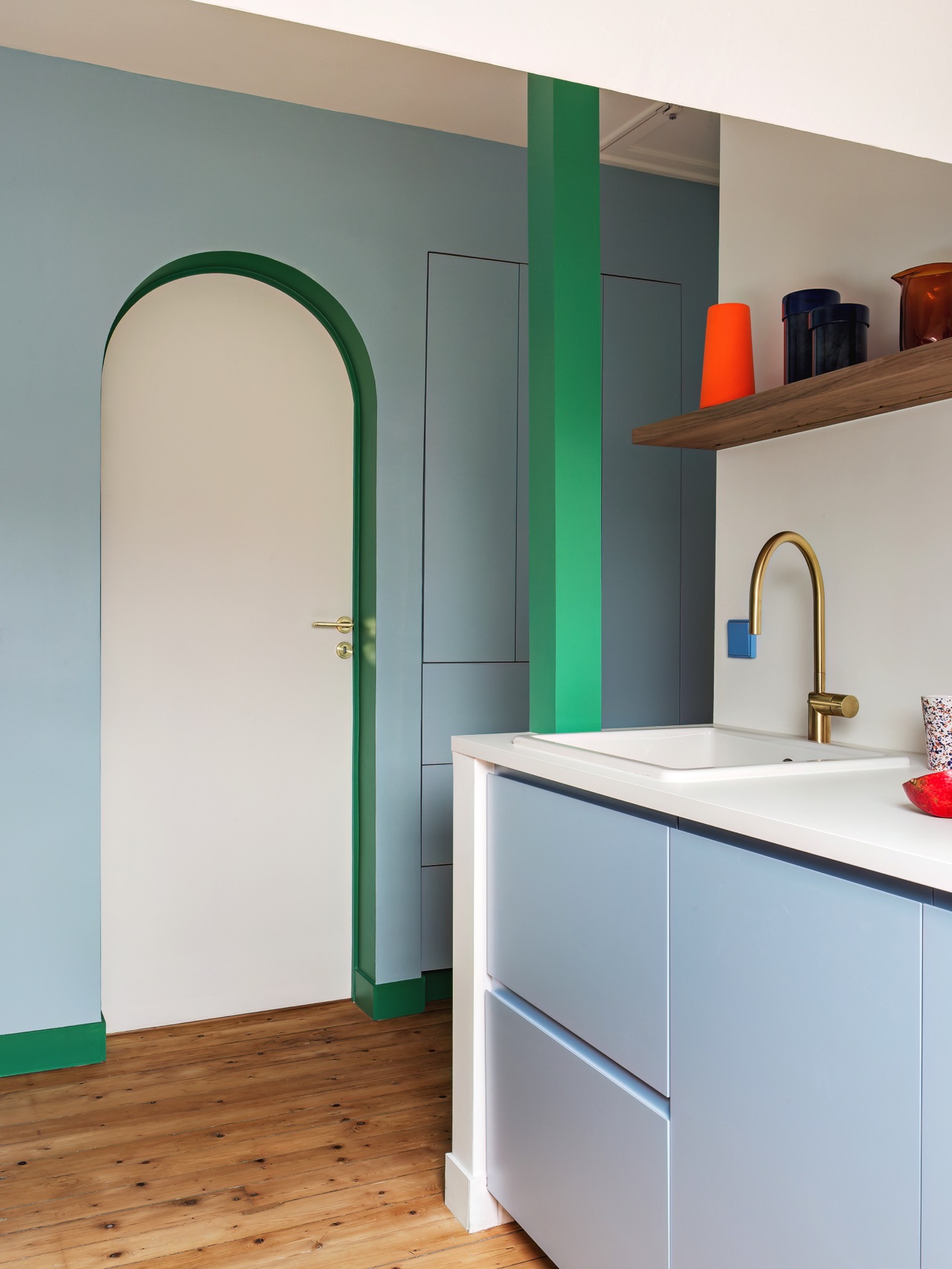 Eine super frische Verbindung ist das satte Hellgrün Leaf in Verbindung mit dem pastelligen Blau Ciel voilé Süße Idee Bei dieser Küche wurden Ikea Schränke verwendet und mit Fronten von Plum Living aufgewertet Details in Neonfarben dazu kombinieren