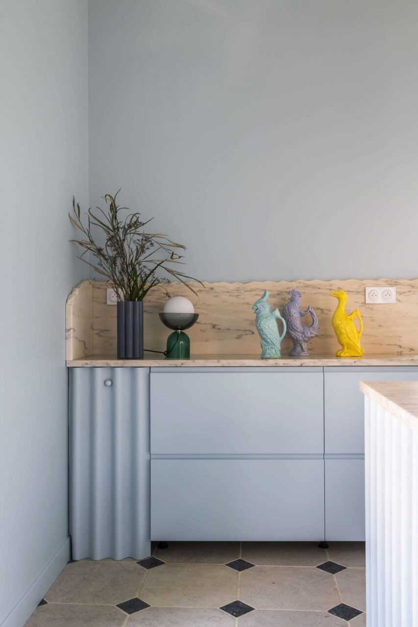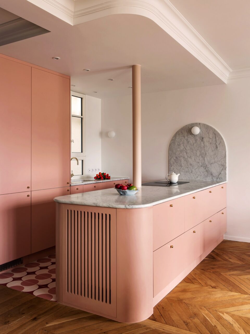 - Die eigentlich gerade Küche wurde mit runden Akzenten versehen und wird dadurch zu etwas ganz Besonderem. Dazu zählt die Wandfläche aus Marmor, die Säule und vor allem der angesetzte Schrankbereich mit Lamellen. Im Ton „Blush“ von Plum Living.