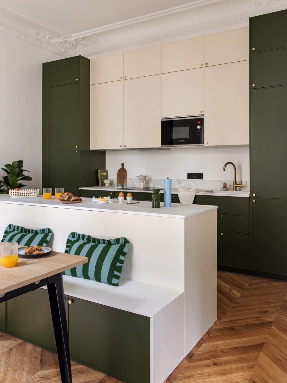 - Diese Bank steht nicht einfach nur an der Küchenzeile, sie ist komplett integriert. Auf diese Art und Weise ist ein gemütlicher und attraktiver Raumteiler entstanden. Mit matten Fronten von Plum Living.
