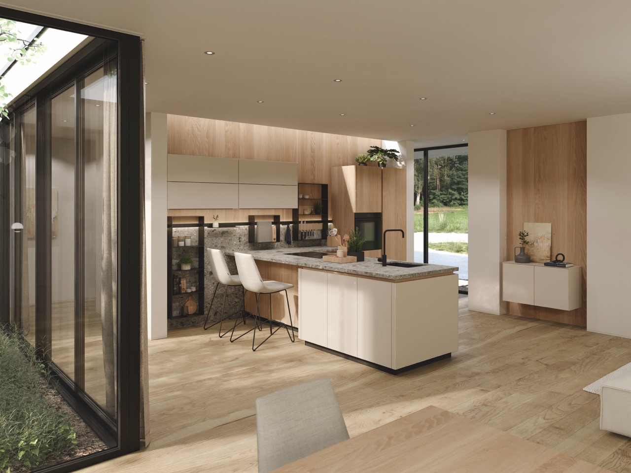 Ein feines Gestaltungsmittel sind offene Regale, die direkt in geschlossene Schrankfronten integriert sind. Sie unterbrechen große Frontflächen, ohne deren Ruhe zu stören, und schaffen kleine Zonen für Persönliches. Keramik, Kochbücher, Vasen oder eine einzelne Leuchte finden hier ihr Zuhause. Oft Ton-in-Ton gehalten oder bewusst etwas dunkler abgesetzt, sehen diese offenen Elemente wie grafische Einschnitte aus, subtil, aber wirkungsvoll. Der Reiz liegt im Wechselspiel. Geschlossenes vermittelt Ordnung und Ruhe, offene Regale bringen Leichtigkeit und Individualität. Gerade in puristisch geplanten Küchen entsteht so eine wohnliche Balance, die den Raum weniger technisch und deutlich lebendiger erscheinen lässt.