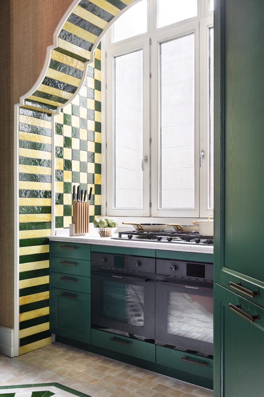 - Die Küche von Schmidt ist mal anders gedacht mit ihrer Platzierung in einer Nische. Dazu erscheint sie wie auf einer Bühne durch ihre Umrandung mit den glänzenden Fliesen im mutigen Farbmix. So wird klar, dass auch schlichte Küchen zu einer persönlichen Inszenierung werden können.