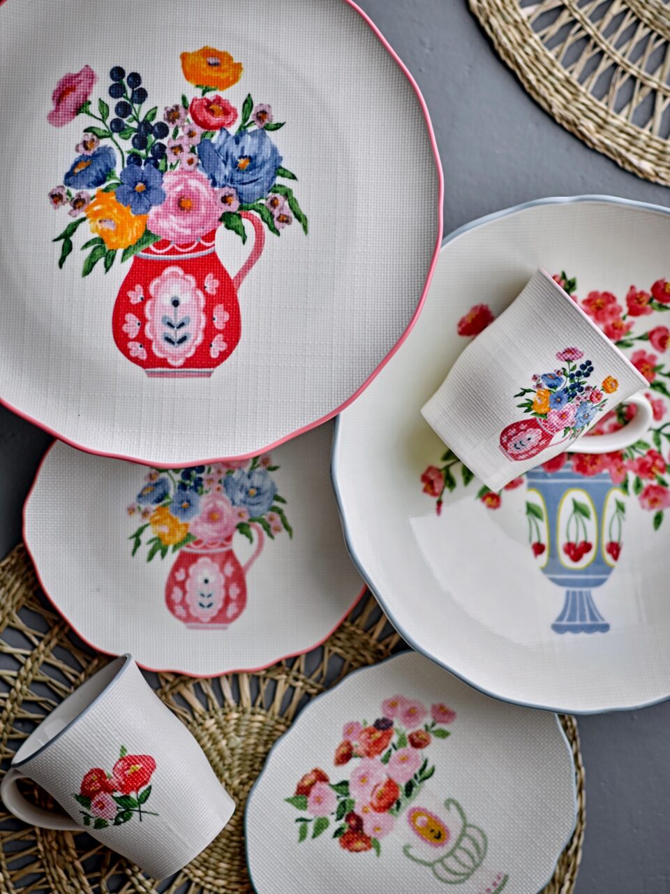 - Credit: Bloomingville Teller, Tassen und auch eine Kuchenplatte gehören zur Serie „Dorothy“ von Bloomingville. Besonders ist das geprägte Blumenmotiv in bunten Farben, das aussieht wie eine feine Stickerei. Das Service ist aus Steingut.