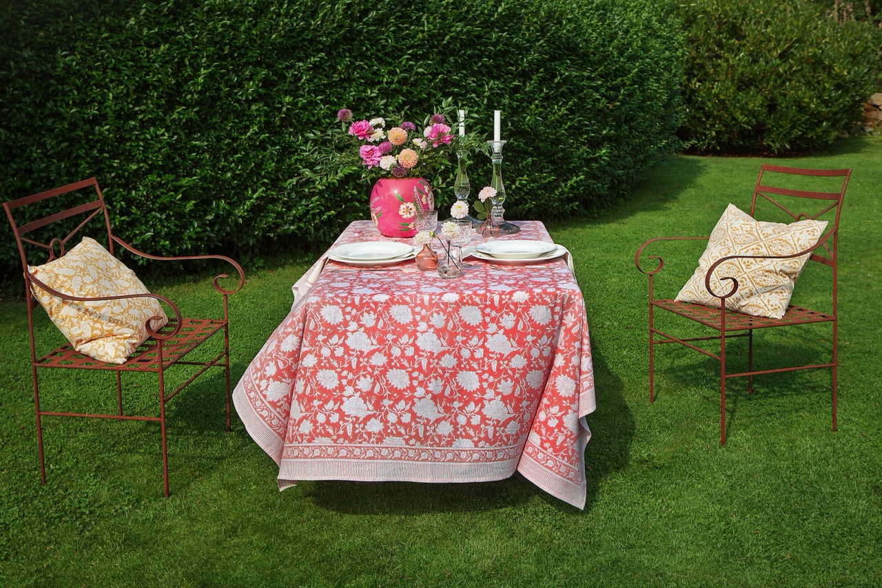 - Aus 100 Prozent Baumwolle besteht die Tischdecke „Indian Rose“ von Chamois. Das Muster ist inspiriert von Reisen durch Indien, gemixt mit einer Prise Vintage-Flair. Der Blumendruck wird handgefertigt mit viel Liebe zum Detail.