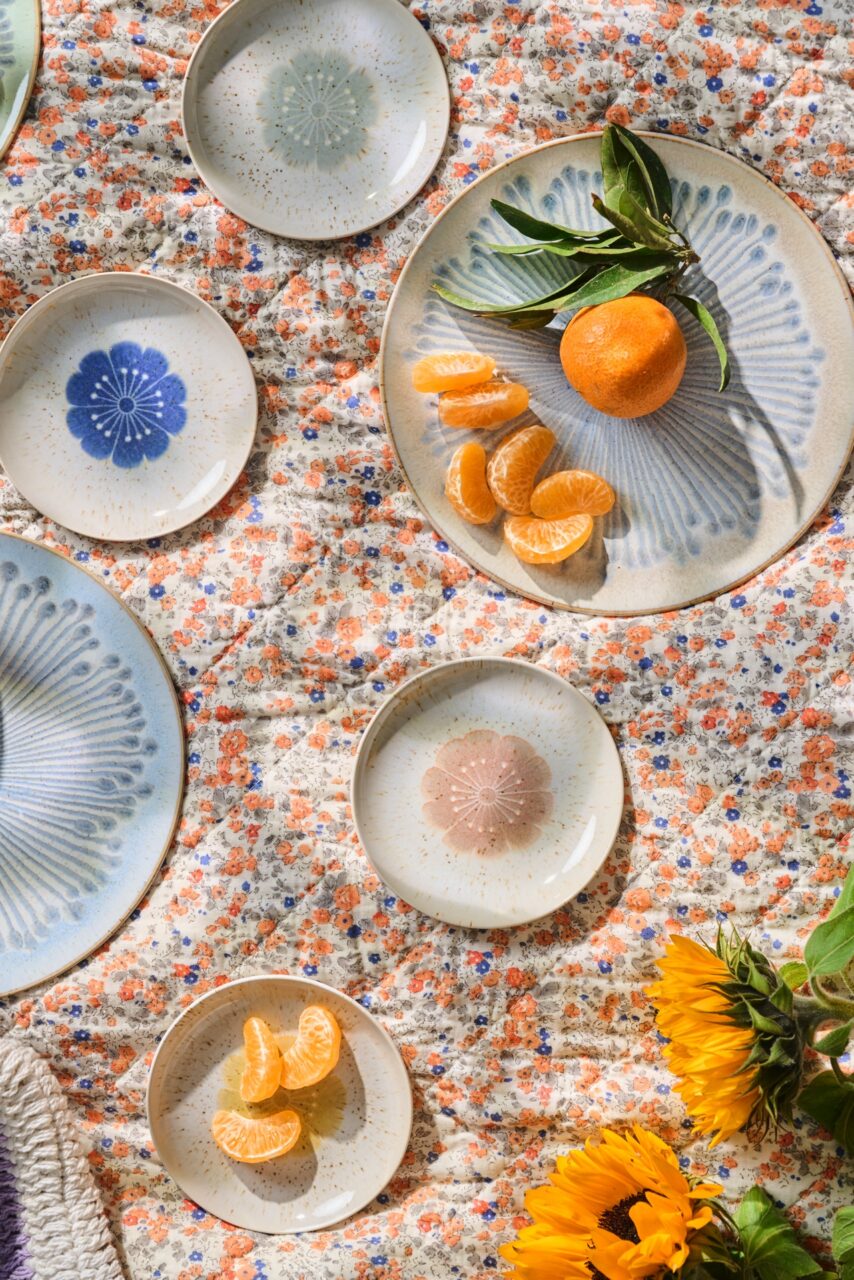 - Blumen soweit das Auge reicht. Die niedlichen Schalen aus Steingut gibt es in vier Farben. Um den Look vollständig zu machen, ist die gesteppte Decke mit filigranen Blüten genau richtig. Alles von Ib Laursen.