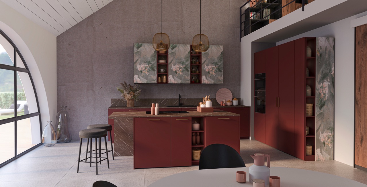 - Eine gute Alternative zu einem Bild an der Wand sind die blumigen Fronten aus der Serie „Concrète-Flower“ von Schmidt Küchen. Richtig schön sehen dazu die hübsch arrangierten Trockenblumen aus, die das ganze Jahr über auf der Arbeitsfläche stehen können.