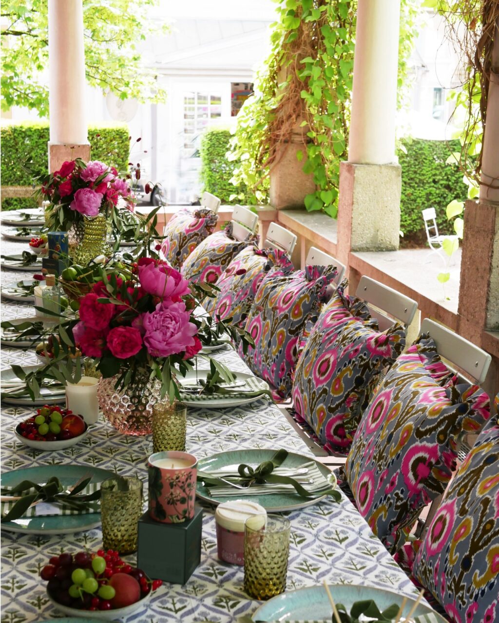 - Ein sommerliches Frühstück im Rosengarten, das lässt einen sonnigen Tag sehr gut starten. Ein Highlight auf dem Tisch ist die Tasse und die Textilien mit Blütenmuster. Alles ist von GreenGate.