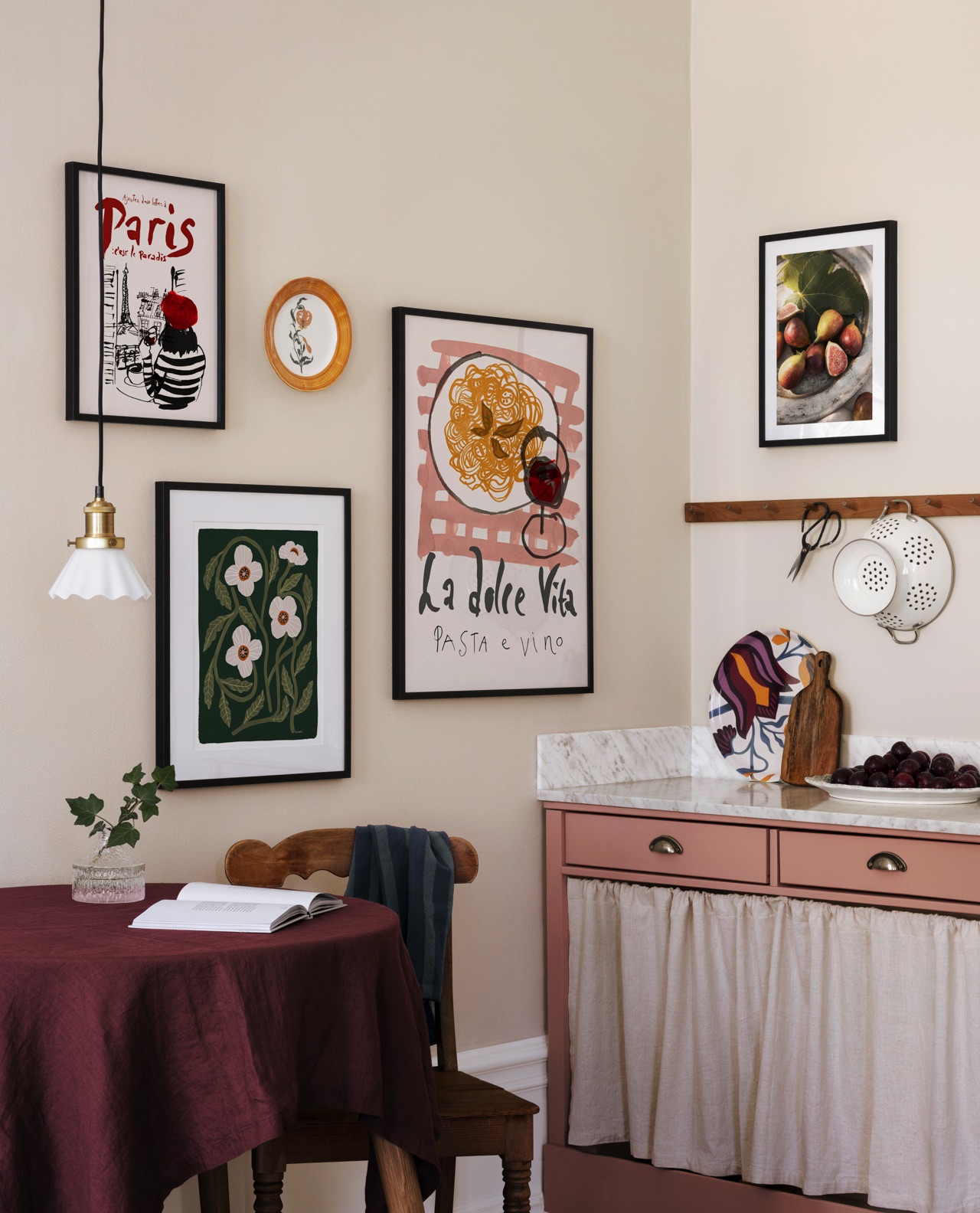 Aubergine und Rosa sind hier die vorherrschenden Farben Die Anrichte das Tischtuch die Poster alles greift diese Farben auf Sie wirken so dezent dass sie zwar Wärme in den Raum bringen aber nicht zu sehr auffallen Eine ideale Kombi Die Poster sind von Desenio