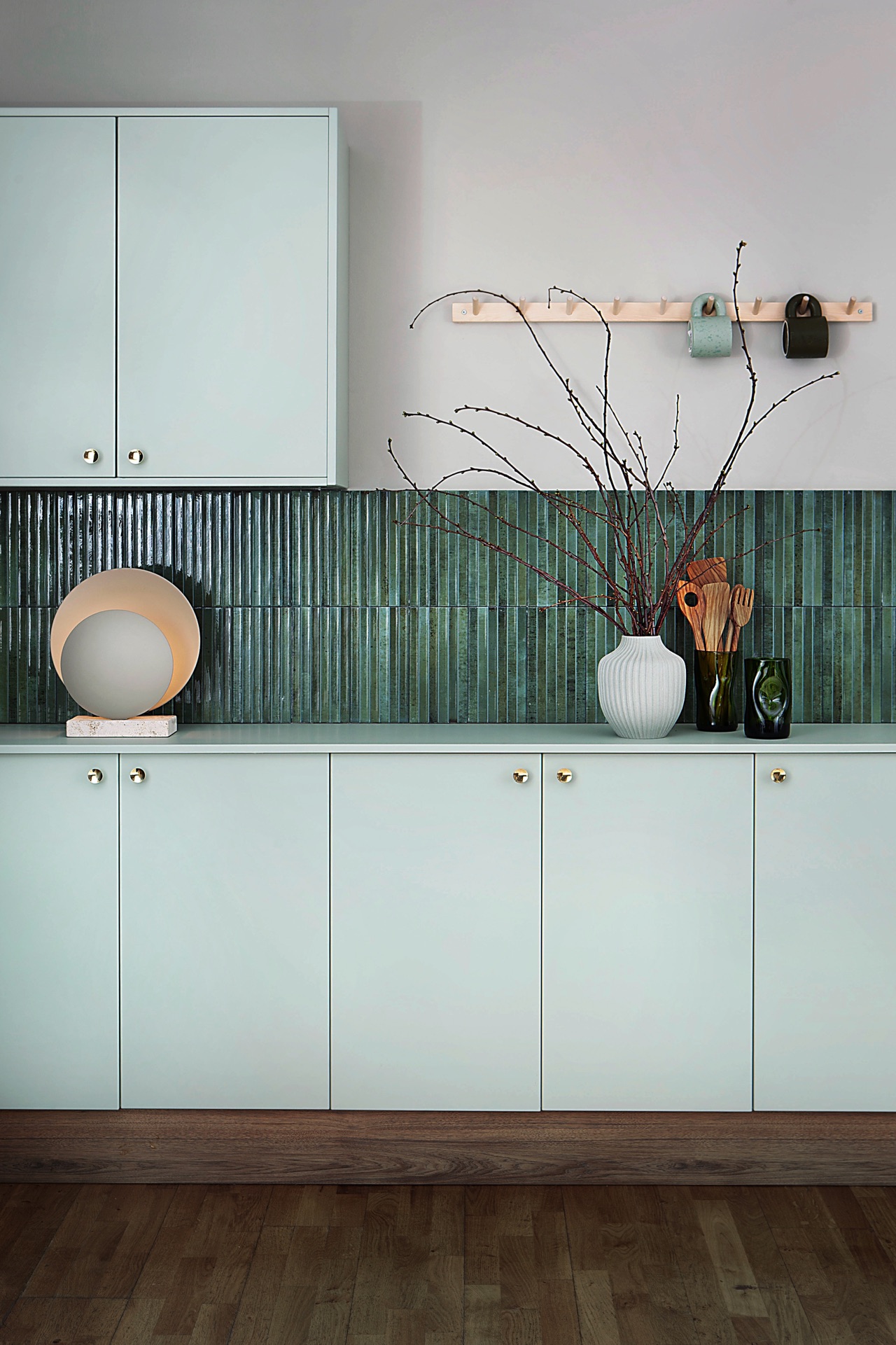 Alle Farben passen zu einer Farbschiene. Die hellgrünen Fronten sehen schick aus zu den kräftig grünen Riemchenfliesen. Die Küche ist von Härjedlas Kök.