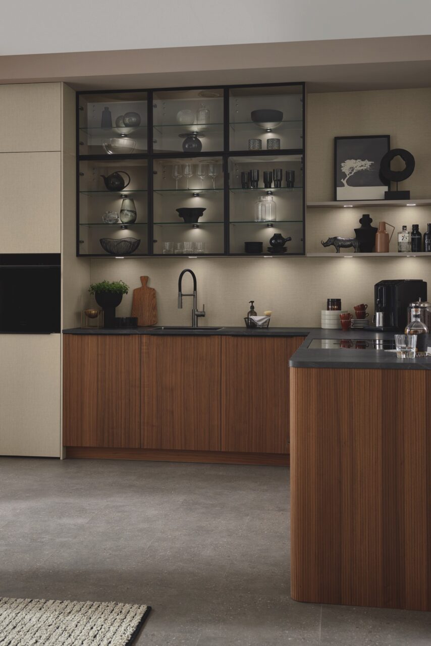 Ein klarer Trend sind Rillenfronten. Ob vertikal gefräst, fein lamelliert oder als handwerklich wirkende Reliefstruktur, Rillen bringen Tiefe und Spannung ins Design. Sie spielen mit Licht und Schatten, verleihen Küchenmöbeln Charakter und schaffen eine edle Haptik. Besonders beliebt sind helle Holzfronten mit matter Lackierung oder dunkle, graphitfarbene Oberflächen, bei denen das Spiel der Vertiefungen besonders schön zur Geltung kommt.