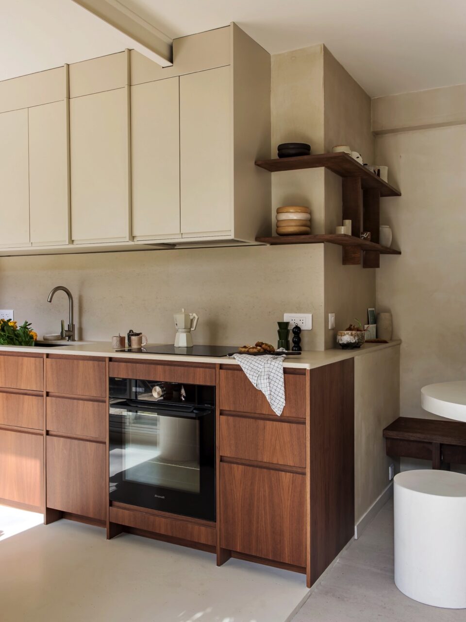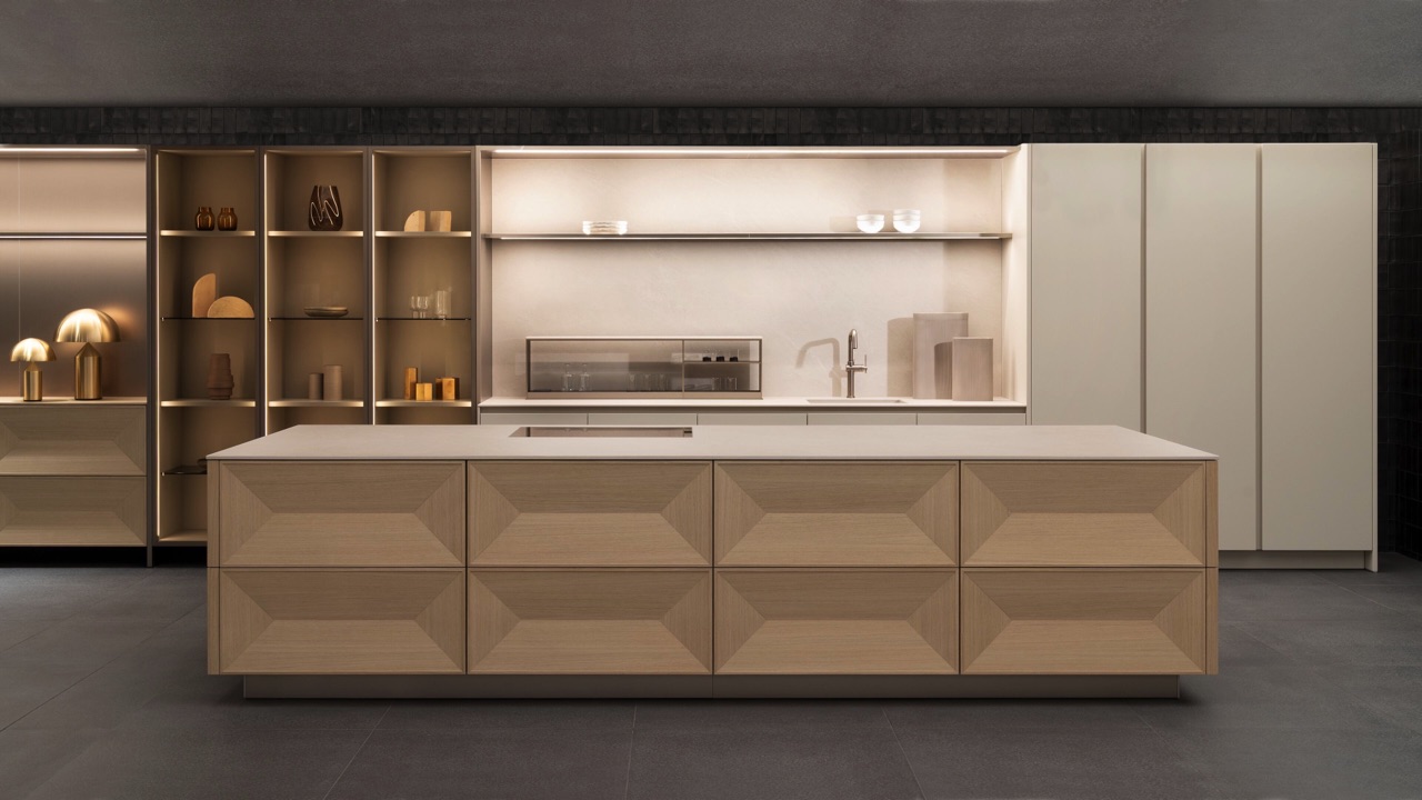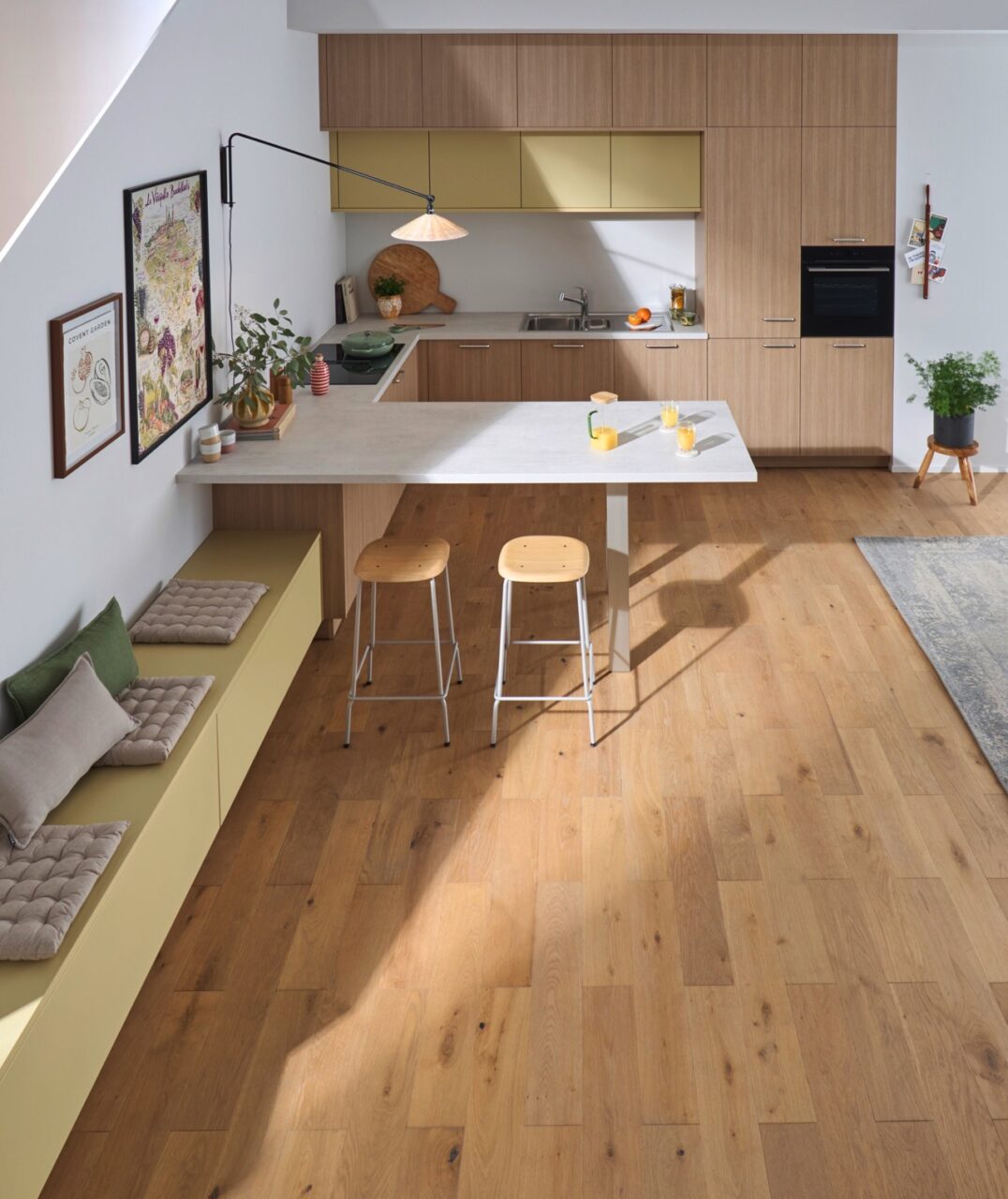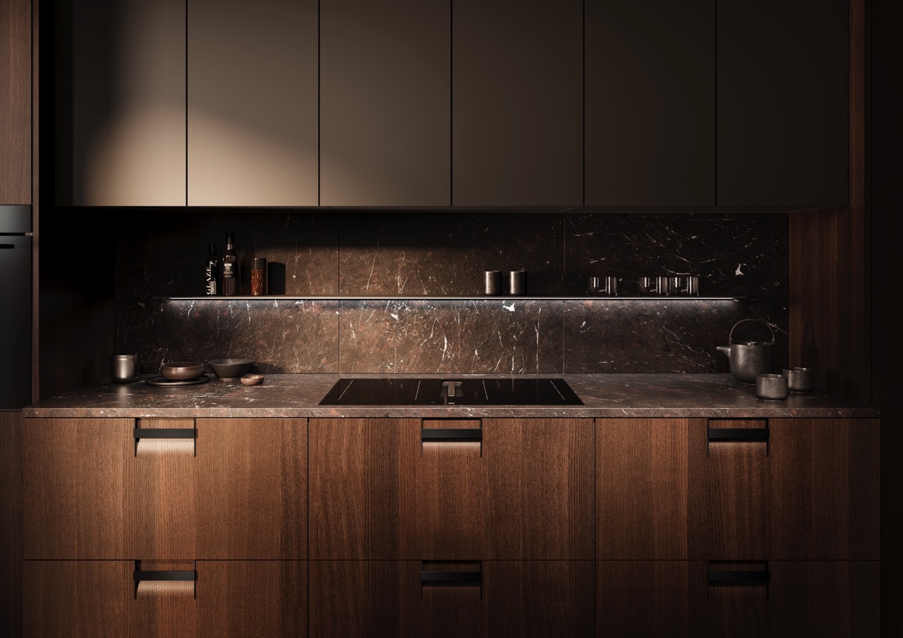 Holz feiert sein großes Comeback, aber in neuer, puristischer Form. Statt rustikalem Charme bestimmen glatte, matte Oberflächen und sanfte Maserungen das Bild. Eiche, Nussbaum und Esche werden leicht geölt oder in gedeckten Tönen lasiert. Die Kombination mit Stahl, Stein oder Keramik betont die Modernität. Holz bringt Wärme und Lebendigkeit in minimalistische Räume und sorgt dafür, dass Küchen trotz Hightech-Ausstattung wohnlich bleiben.
