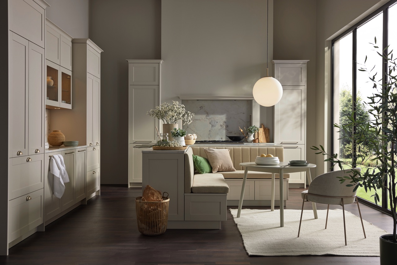 - Landhaus wurde hier neu gedacht in zartem Greige und im modernen Umfeld. Die neue Rahmenfront „Chester“ von Nolte Küchen strahlt Cottage-Flair aus. Die monochrome Planung in „Sahara“ transportiert den Kuschelfaktor in die Küche, besonders durch den integrierten Essbereich. Landhausgriffe in Manganbronze finden sich in zwei Formen, als Bügelgriff und als Griffmuschel.
