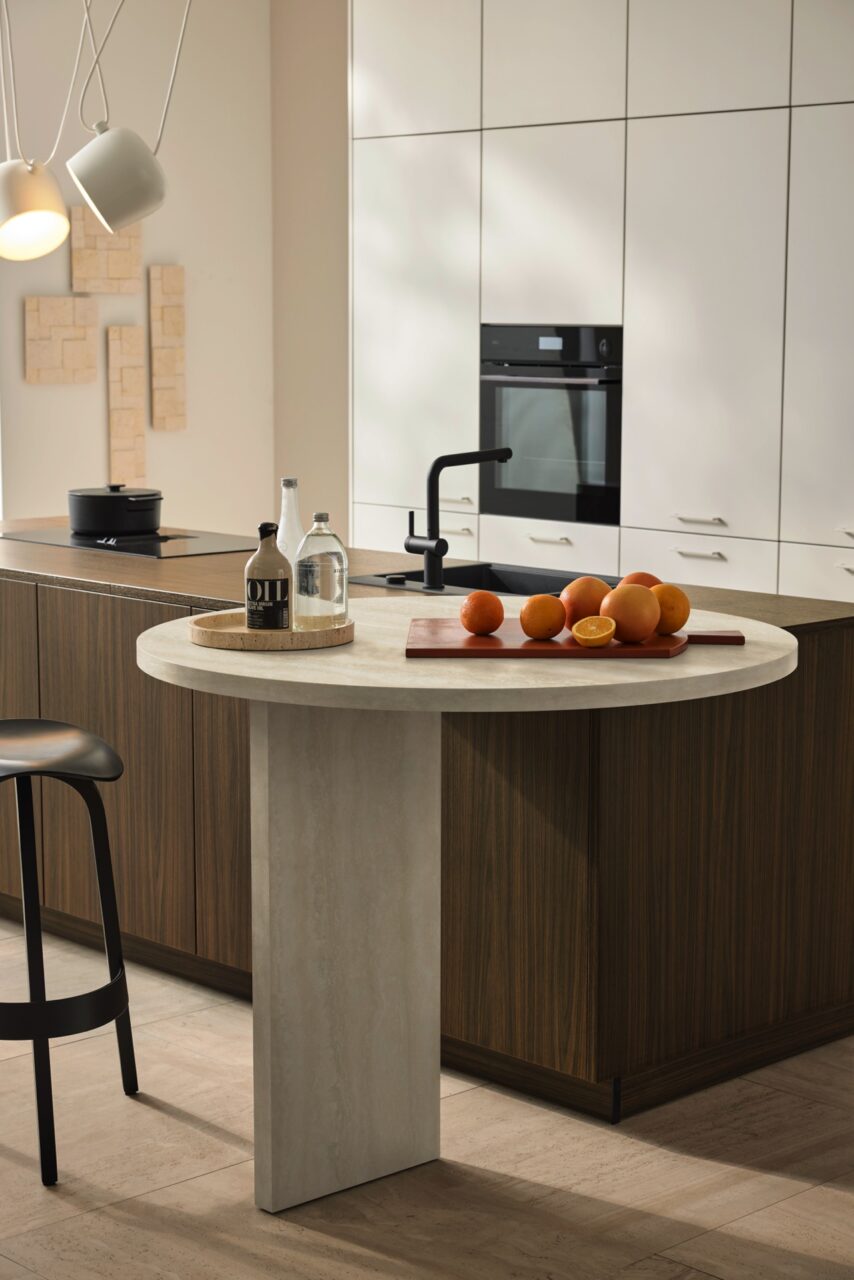 2025/26 verabschieden wir uns endgültig von strengen Linien und kantigen Formen. Stattdessen ziehen organische, weiche Silhouetten in die Küche ein. Sie lösen die geometrische Strenge der letzten Jahre ab. Inseln und Arbeitsplatten mit abgerundeten Ecken, geschwungene Fronten und sanft geschliffene Kanten sorgen für ein harmonisches Gesamtbild. Diese fließenden Formen wirken nicht nur wohnlicher, sondern ebenfalls ergonomischer und lassen den Raum ruhiger und einladender erscheinen. Besonders hübsch ist diese Ästhetik in offenen Küchen, die in den Wohnbereich übergehen.
