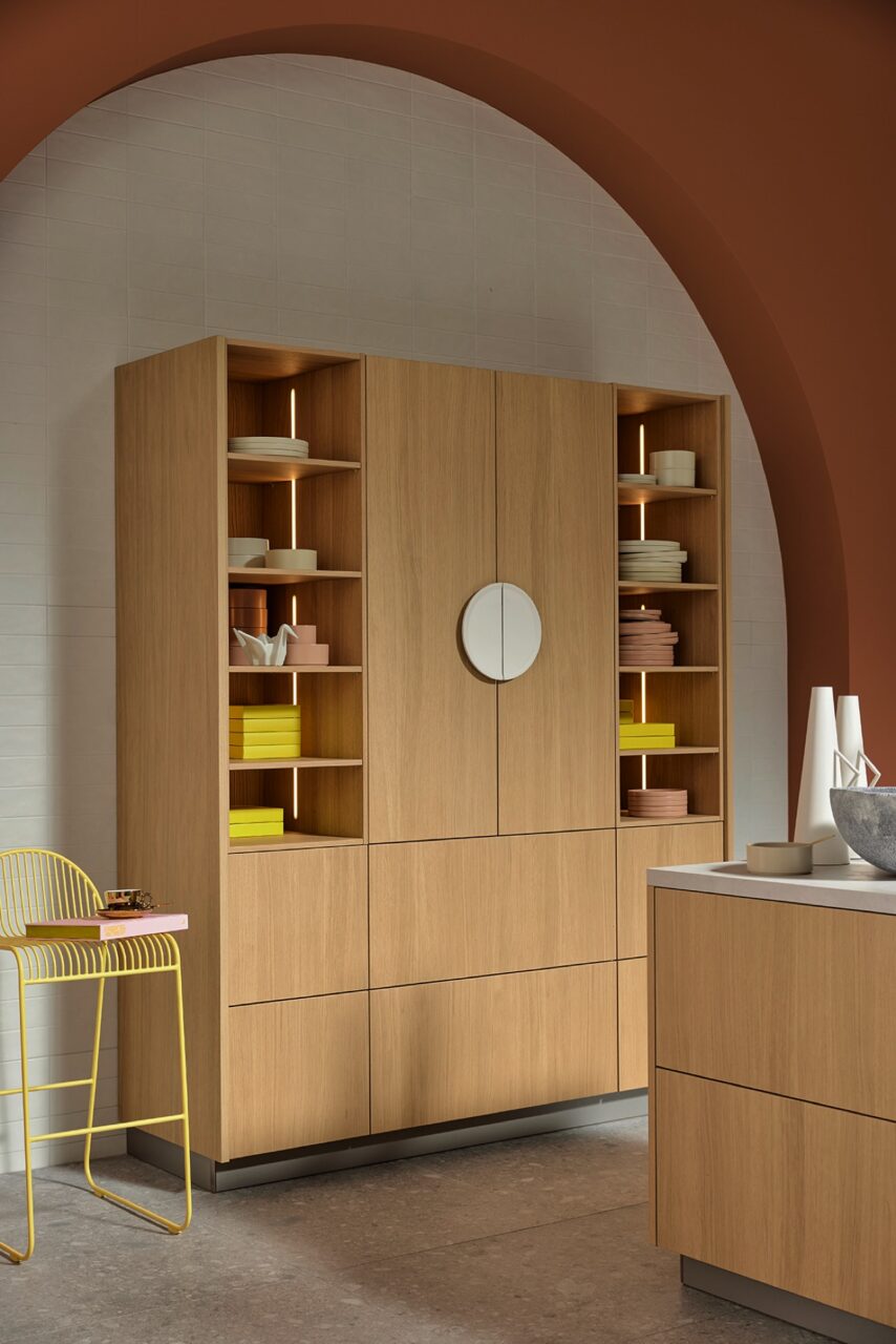 - Eine einladend warme Aura schafft die Mix-and-Match-Idee von Ballerina mit verschiedenen Dekoren. Für einen Wow-Effekt sorgen die Hochschränke „Rattana“ mit ihrem Flechtfurnier in „Eiche Gavi hell“. Die großzügige Kochinsel bildet den Mittelpunkt fürs Kochen und Verweilen.