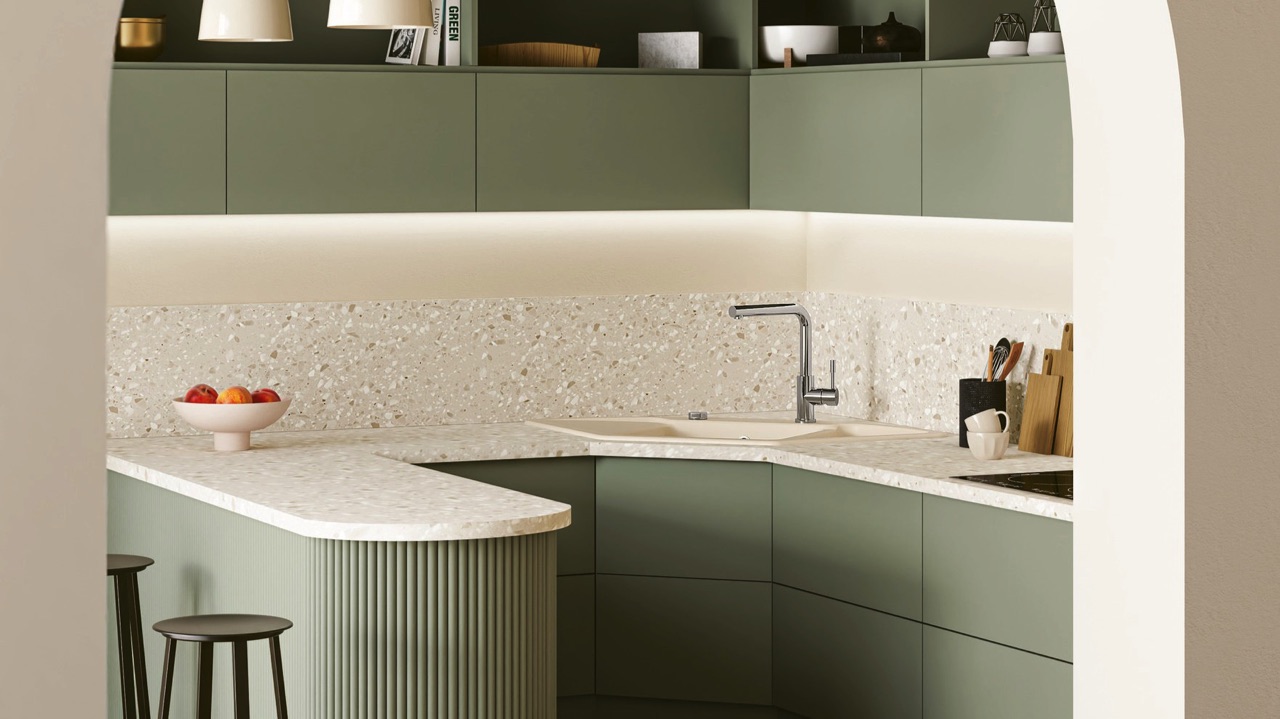 - Rillenfronten in hellem Salbeigrün ergeben ein gelungenes Spiel aus Licht, Schatten und Struktur. Das macht die Küche modern und klar. Die Insel ist der Eyecatcher in der kompakten Küche. Villeroy & Boch ergänzt die Einrichtung durch die hochwertige Keramikspüle und Armatur, die mit ihrer Ästhetik und Benutzerfreundlichkeit überzeugen, beides ist sehr robust.