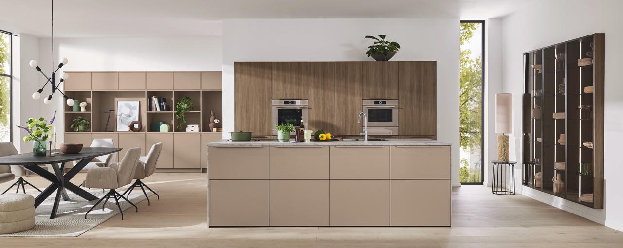 Bei Nolte gibt es das bewährte Mattlack-Konzept. Es wird ergänzt von neuen Gestaltungsmöglichkeiten und Farben. Schön ist der neue Ton „Greige“ in matter Optik. Die Kollektion „Evora Lack“ ist filigran und wirkt leicht. Sie zeigt sich flexibel und kann individuell geplant werden. Praktisch ist die Push-to-open Variante.