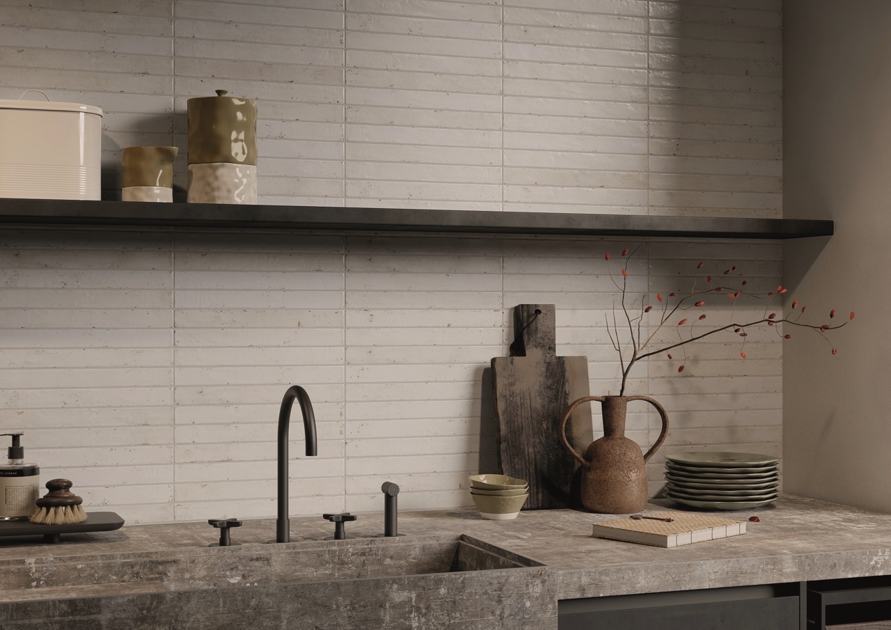 - Mit Ton-in-Ton Elementen strahlt ein Raum noch mehr Ruhe aus. Hier hat das Ambiente ein besonderes Zusammenspiel, denn alles ist in Beige und Grau gehalten. Schön sind die sehr natürlichen Fliesen “Bricks” in “Noho White”. Arbeitsfläche und Spülbecken kooperieren ideal miteinander und werden zur Einheit. Fliesen von Porcelain Superstore.