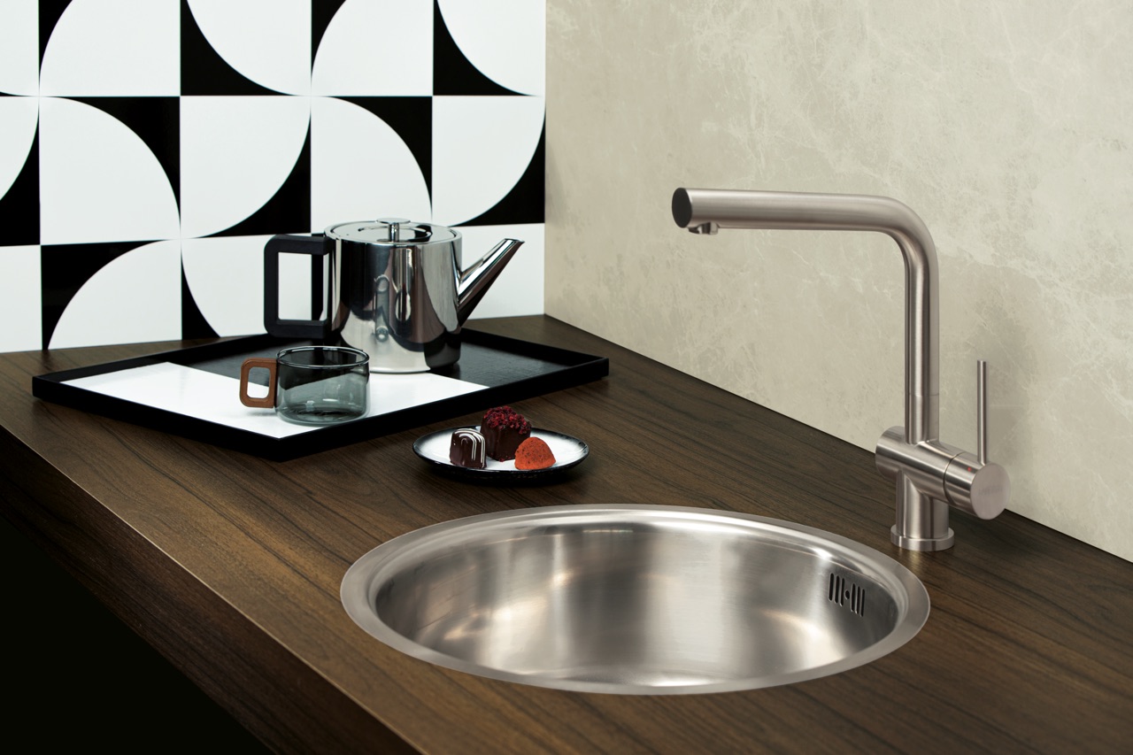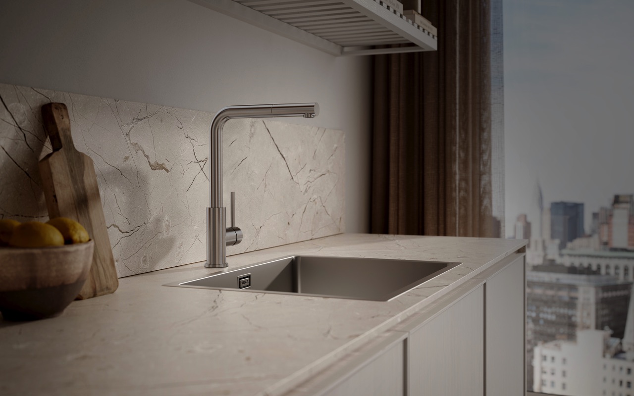 Flächenbündiger Edelstahl und Edelstahl-Armatur – zusammen bilden sie eine minimalistische Einheit. Außerdem erscheint der Look wie in einer professionellen Gastro-Küche.