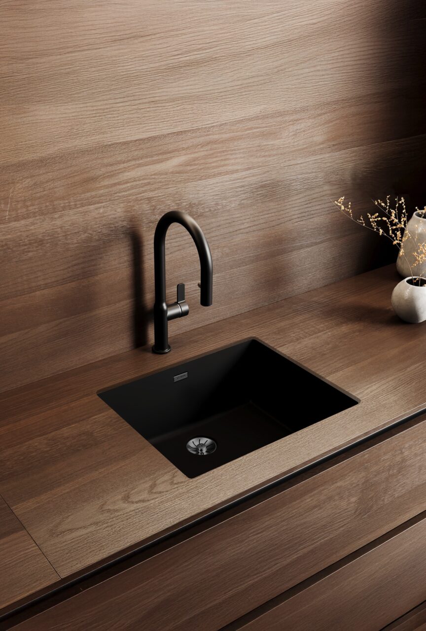Schwarzes Komposit und Gunmetal matt – das ist eine zeitgenössische, grafische Kombi. Sie harmoniert zu Fronten in Eiche, Nussholz oder Beton.