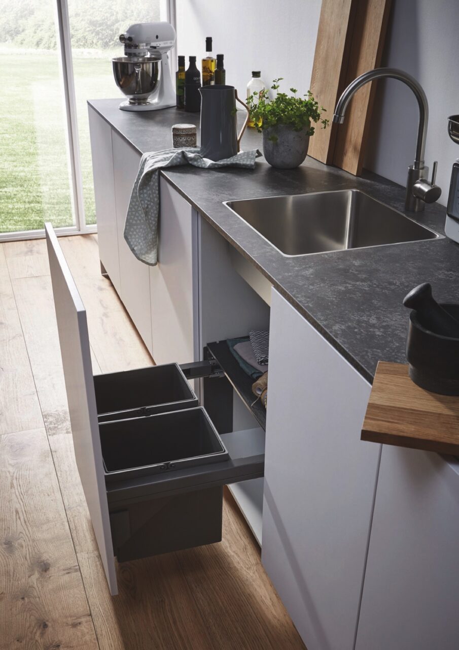 Wertstoffe lassen sich komfortabel sammeln und sichern. Mülltrennsysteme werden für alle Schranktypen angeboten. Wer sich erst später dafür entscheidet, kann sie auch nachrüsten. Die Abfallbehälter sind inzwischen sehr ästhetischen und langlebig. Gute Systeme erleichtern das Abfallsammeln und leisten einen effektiven Beitrag zum Umweltschutz. Ein immer noch sinnvolles Beispiel für richtiges Mülltrennen sind Abfallsammler als Frontauszug-System. Ausgestattet sind sie meist mit einem Softeinzug und integrierter Dämpfung. Hilfreich ist das Deckel-Auszug-System, das sich beim Schließen des Frontauszugs über sämtliche Behälter schiebt.
