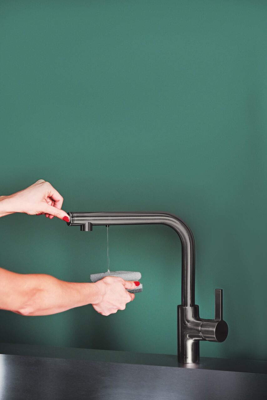 Armatur „Flex Square“ vereint markante Optik mit Alltagstauglichkeit. Schön ist die eckige Form, hilfreich der flexible Ausziehschlauch. Er macht jede Bewegung mit, beim Abspülen oder Befüllen großer Gefäße. Super edel ist die Farbe „Kupfer Rosé“. Das neue Design bietet auf Knopfdruck 100 Grad kochendes Wasser. Die dadugehörige Technik ist intuitiv.