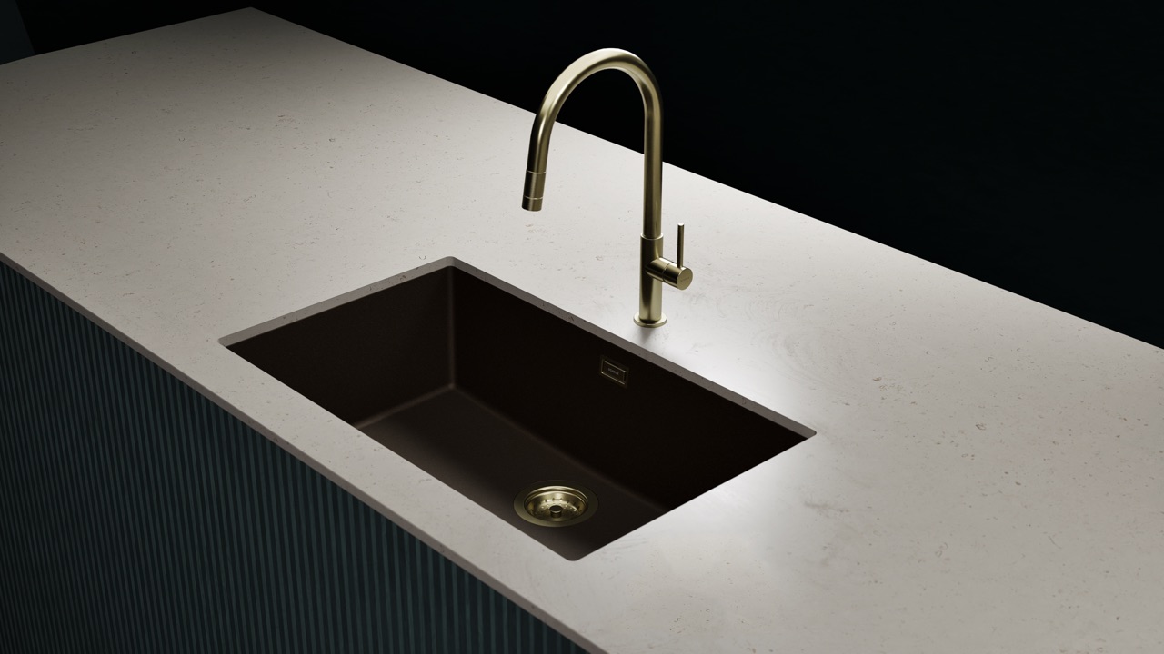 - Spüle und Armatur im gleichen Ton bringen eine angenehme Optik. Wer ein Statement setzen möchte, greift zu Weiß mit Messing, Schwarz mit Gunmetal oder Edelstahl mit Soft Bronze.