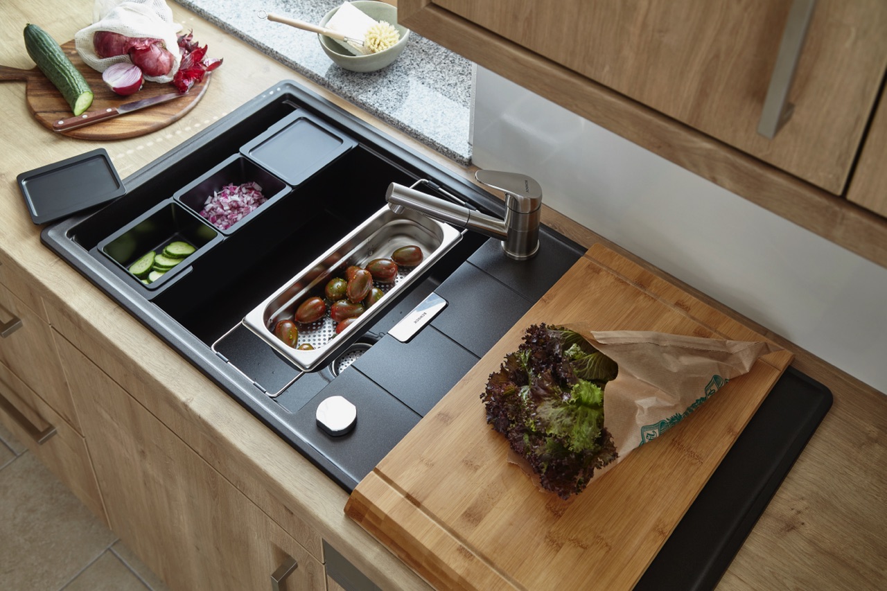 Kochendwasser- und Multifunktionsarmaturen liefern 100 Grad heißes Wasser für Tee, Pasta oder zum Sterilisieren. Oft kombinieren die Armaturen damit gefiltertes oder gekühltes, stilles oder sprudelndes Trinkwasser. Das spart Geräte, Platz und Plastik. Ein Auszug mit Brause ist inzwischen Standard. Oft lässt sich die Armatur umschalten zwischen einem spritzarmen Laminarstrahl und einer Brause für echte Spülpower. Hilfreich sind Schwenkbereiche von 120 bis 360 Grad, denn sie erhöhen die Reichweite. Das alles erleichtert den Alltag. Eine wirkliche Bereicherung sind nach wie vor berührungslose Touch-Varianten. So kann man selbst mit Teig-Händen den Wasserfluss auslösen und die Griffe bleiben sauber. Kaltstart-Mechaniken, Wasserspar-Perlatoren und bleifreie Legierungen punkten in Sachen Nachhaltigkeit. Wichtig sind auch Kindersicherungen für mehr Sicherheit, ein gutes Energiemanagement, um hohe Kosten zu vermeiden. Für Komfort sorgen akustisch ruhige Laminarregler gegen Spritznebel, sowie optimierte Durchflusswerte. Zubehörsysteme sind der heimliche Gamechanger. Dazu gehören Einhängeschalen, höhenversetzte Ebenen, Rollroste, passgenaue Schneidbretter, Abtropfgitter und Schienensysteme. Das alles verwandelt die Spüle in eine Prep-Station.