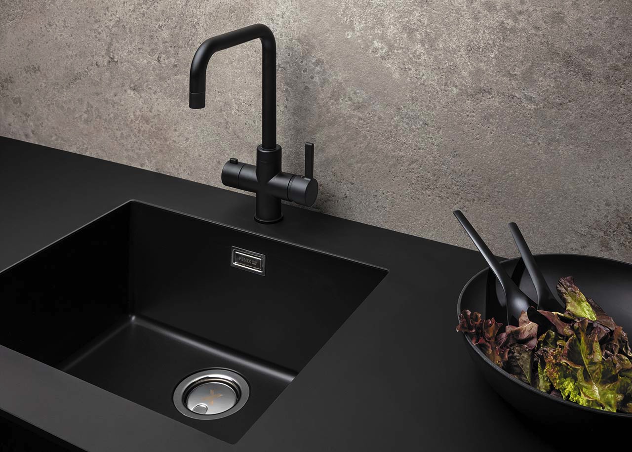 Granitverbund oder Quarzkomposit liefert samtmatte Oberflächen. Die Palette reicht von Kieselgrau über Greige bis hin zu Tiefschwarz. Auch gibt es inzwischen viele farbige Spülen, egal ob Grün, Blau oder Bordeaux, alles ist farbecht. Das Material ist antibakteriell, hat eine hohe Schlag- und Hitzebeständigkeit und eine pflegeleichte, perlende Oberfläche.