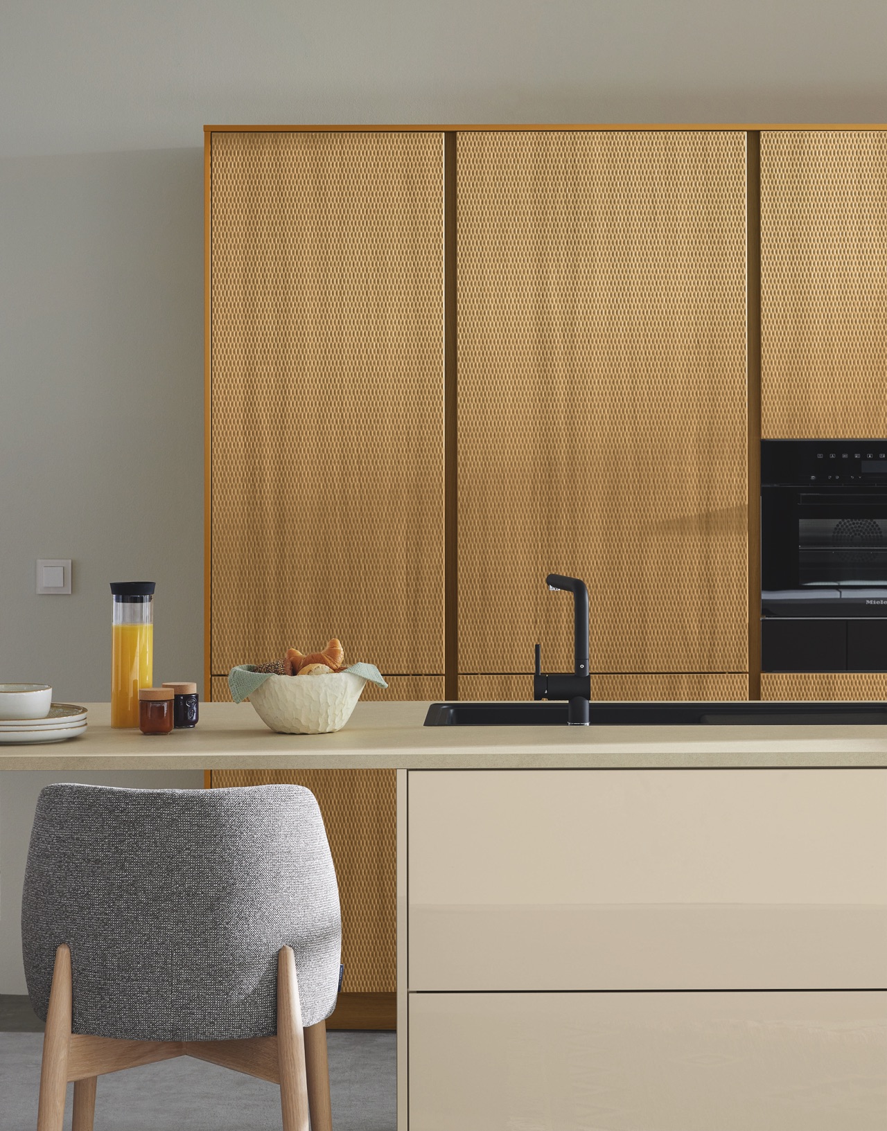 Eher Beige als Greige präsentiert sich die Zeile von Ballerina Küchen Ergänzt wird sie durch die Fronten in Wiener Geflecht Das ergibt einen außergewöhnlichen Stil Pur trifft dabei auf verspielt Die Wand in Greige ist optisch die perfekte Mitte zwischen den beiden Looks