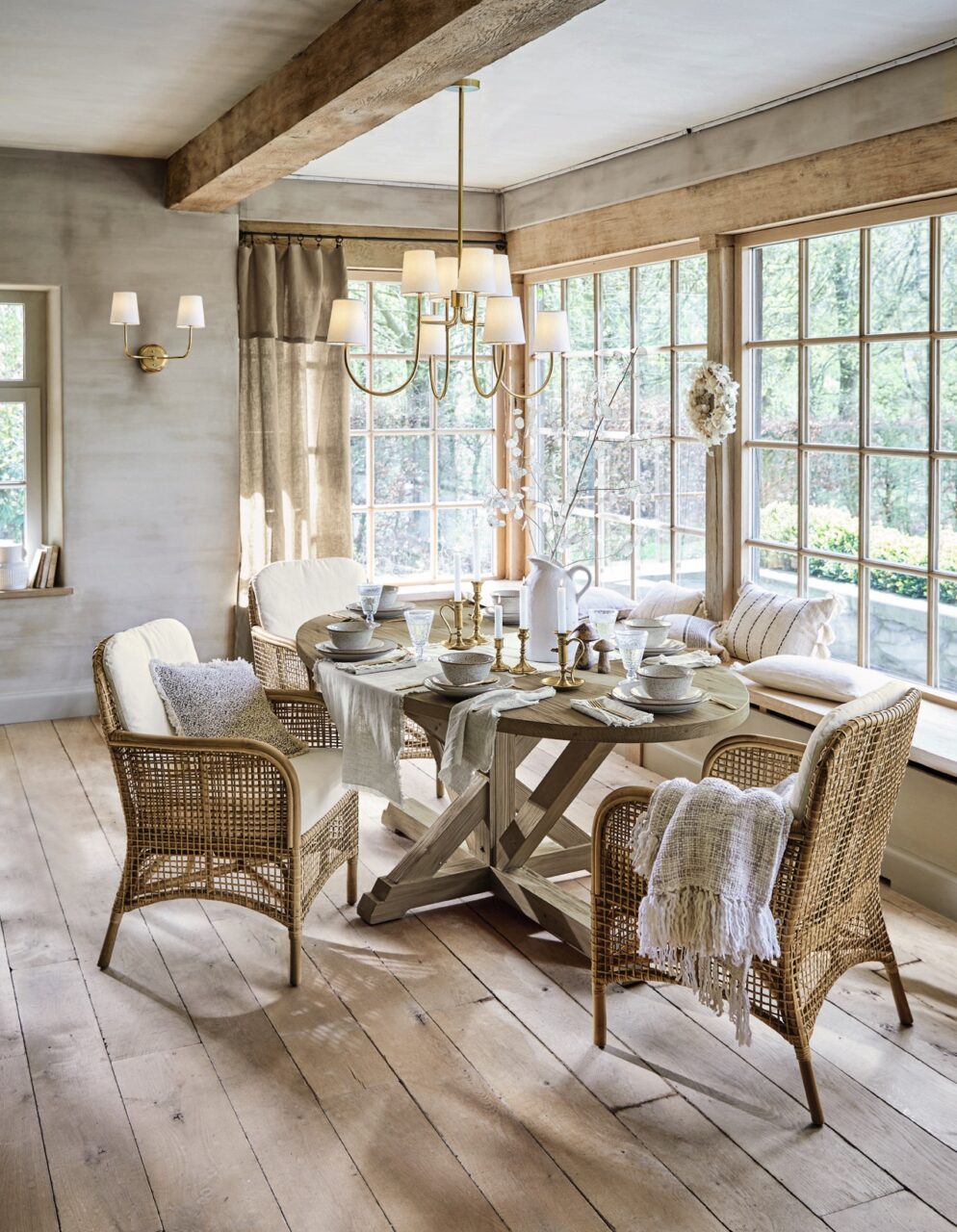 - Ein Eyecatcher ist der massive Holztisch. Er ist groß und benötigt auf jeden Fall etwas Platz, dafür schafft man damit aber einen Ort, an dem alle zusammenkommen und sich wohlfühlen. Ähnliche Stücke lassen sich auf Antikmärkten finden. Die Rattanstühle ergänzen das Arrangement perfekt. Alles von Westwing.