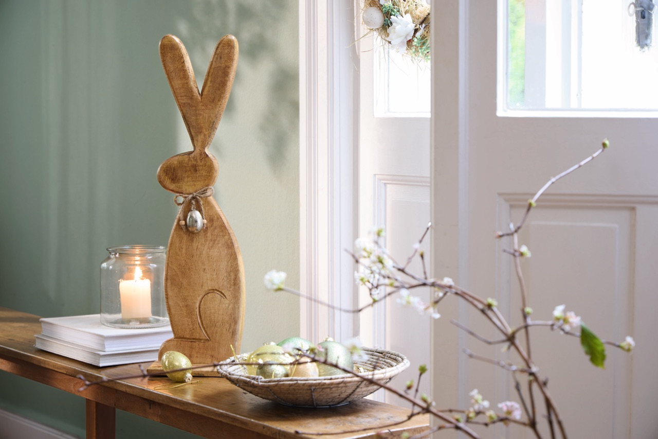 - Der Hase aus Mangoholz ist mit einer Schleife und einem silberfarbenen Ei geschmückt. Er hat eine Höhe von 62 Zentimetern, ist schlicht und durch die Größe dennoch sehr auffällig. Wer mag, kann ihn auch mit einer Schleife verschönern oder ihn sogar bunt streichen. Die Holzfigur ist zeitlos und passt zu unterschiedlichen Küchen-Stilrichtungen, von Ernsting’s Family.