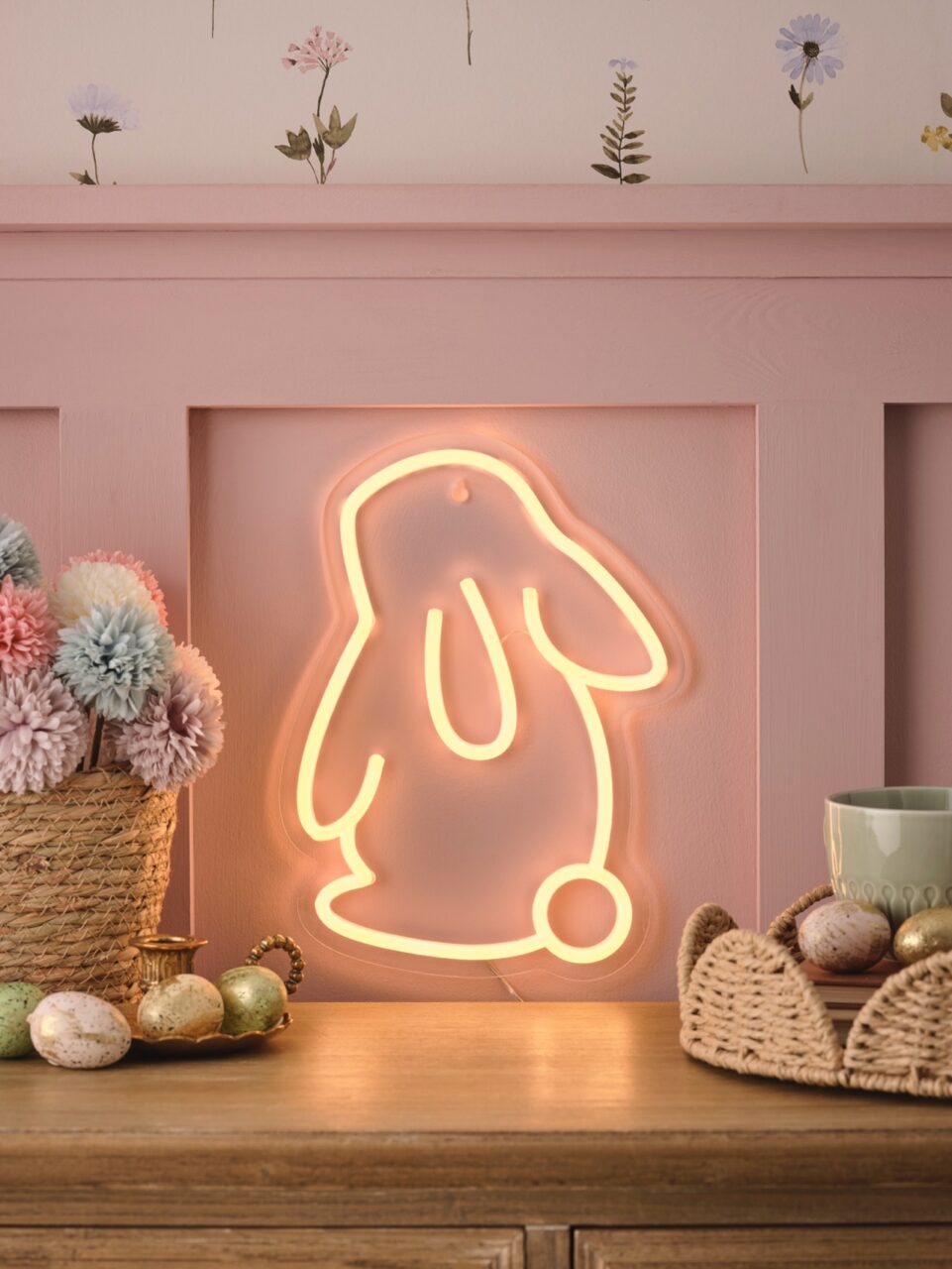 - Die Neonlampe in Hasenform bringt frühlingshafte Akzent in die Küche und ist ein echter Augenschmaus. Normalerweise ist sie fürs Kinderzimmer gedacht, wo sie den Rest des Jahres für einen wohnlichen Look sorgen kann. Der warmweiße Neon-Umriss mit hängenden Ohren und einer kleinen runden Schwanzform ist auf einem transparenten Acrylrahmen montiert. Mit der beiliegenden Fernbedienung kann die Helligkeit in drei Stufen angepasst werden, von Lights4fun.