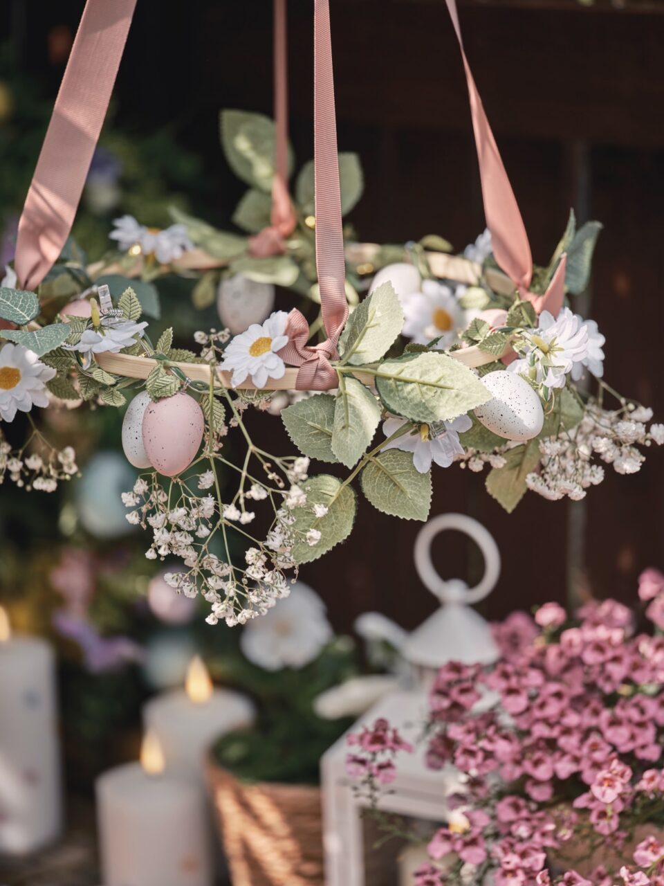 - An einem Metallkranz befestigt ist die 2,3 Meter lange Girlande mit Schlaufe. Sie kombiniert pastellfarbene Ostereier, zarte Gänseblümchen und warmweiße LEDs und schafft eine sanfte und helle Atmosphäre. Die Elemente, die zur Girlande gehören, können ganz unterschiedlich daran befestigt werden, ganz nach Geschmack. Der Kranz kann über dem Esstisch platziert werden. Die Girlande kann aber auch das Küchenregal in Szene setzen, von Lights4fun.