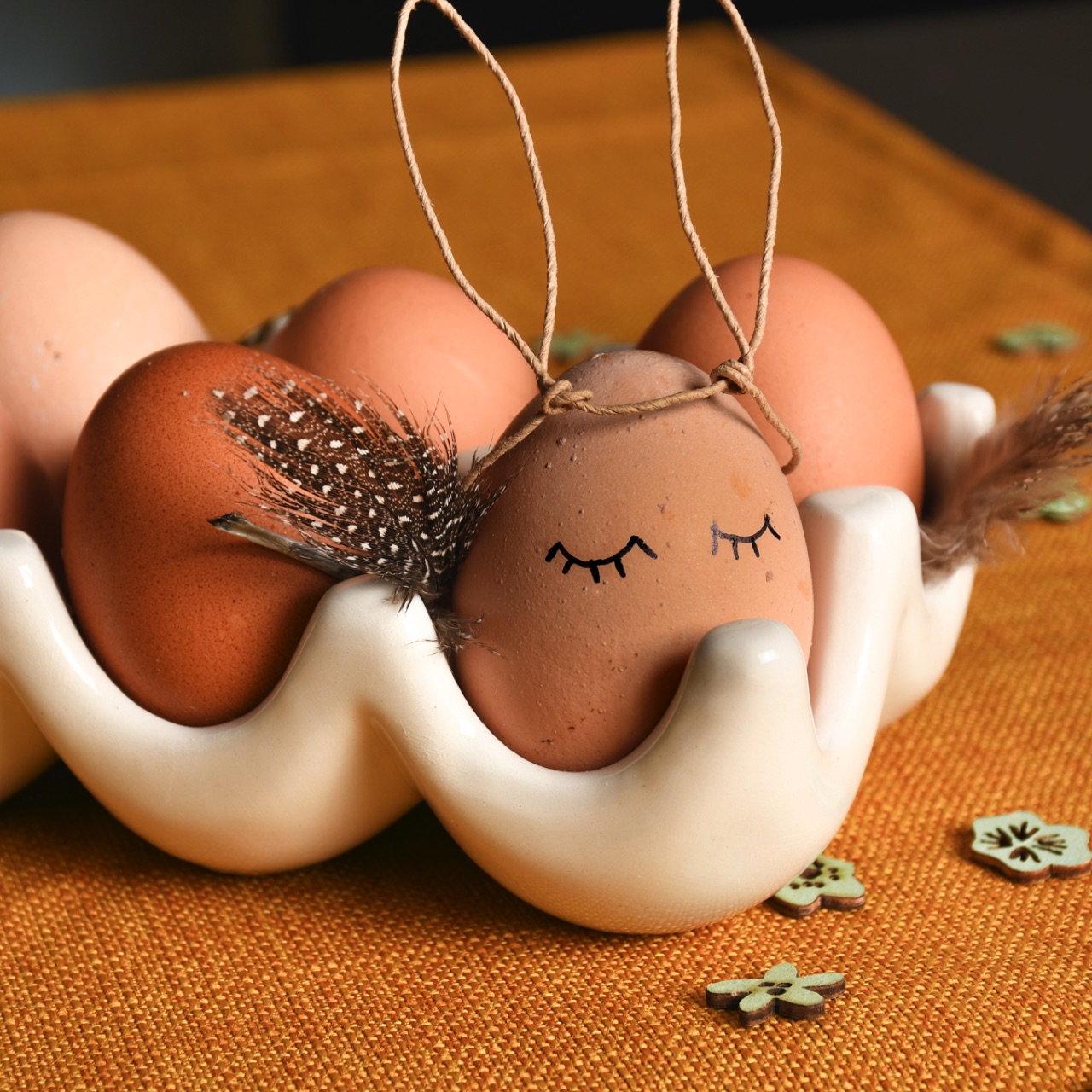 - Zurückhaltend, aber richtig ansprechend kommen die Eier in der Schale daher. Sie werden mit ein paar einfachen Handgriffen in Hasen verwandelt. Die Eier-Häschen sind eine entzückende Idee, auch für gekochte Eier. Zuerst mit einem lebensmittelechten Stift ein Gesicht auf das Ei malen. So bekommt jedes Ei eine eigene Mimik. Für die Ohren bietet sich ein Draht an, zum Beispiel ein Papierdraht, denn er bleibt in Form. Einfach formen und aufsetzen. Idee von Rayher.