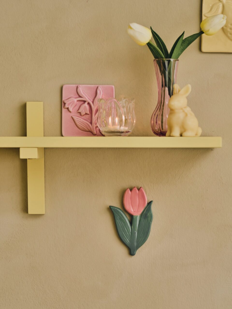 - Die Tulpe ist ein Begleiter für viele Jahre, zumindest die rosa Tulpe an der Wand. Sie kann zu Ostern aufgehangen werden und den Frühling über ihren Platz behalten. Ein Blickfang ist ebenfalls die Kachel mit Schneeglöckchen-Motiv auf dem Regal. Alles von Søstrene Grene.