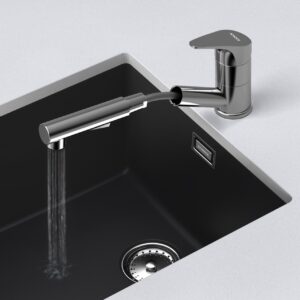 Die neue semi-professionelle Armatur Sina richtet sich an den ambitionierten Koch: Sie vermittelt einen Hauch von Gastro-Küche zu Hause – und unterstützt optimal im Kochprozess. So erweitert sich mit dem aushängbaren Auslauf der Volledelstahl-Armatur etwa der Aktionsradius beim Spülen, und je nach Bedarf kann zwischen Strahl- und Brausefunktion gewechselt werden. Die Höhe der Armatur wurde so gewählt, dass sie auch unter Oberschränken platziert werden kann.
