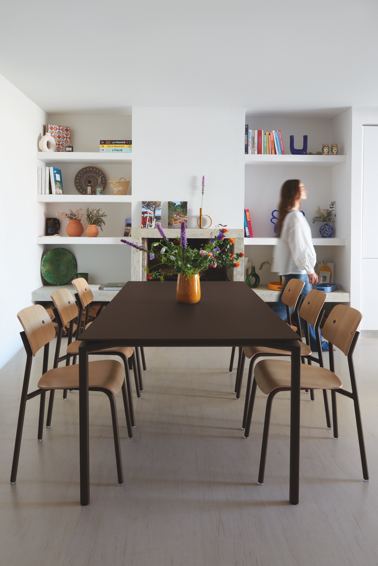 Der Tisch Calvi ist eine gelungene Kombination aus Design und Technologie Die metallische Fenix® Tischplatte ist markant und strapazierfähig Kratzer und Flecken sind kaum zu sehen Er ist in unterschiedlichen Größen erhältlich Die Stühle aus der Serie Studie aus Eichenholz sind ein super Partner dazu Das Gestell aus Aluminiumrohr gibt es in vielen Farben Alles von Fermob
