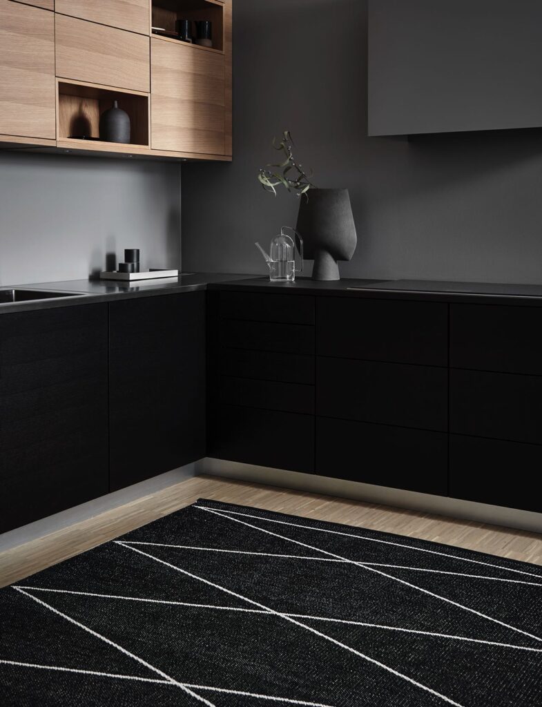 - Mit einem klassischen Rautenmuster begeistert der Teppich „Max“ von Pappelina in Schwarz. Er kann den Charakter der Küche richtig verändern. Aber der Raum lässt sich, ohne den Teppich, ganz leicht wieder in den Ursprungszustand zurückversetzen. Praktisch: Er ist einfach zu reinigen, ca. 164 Euro.