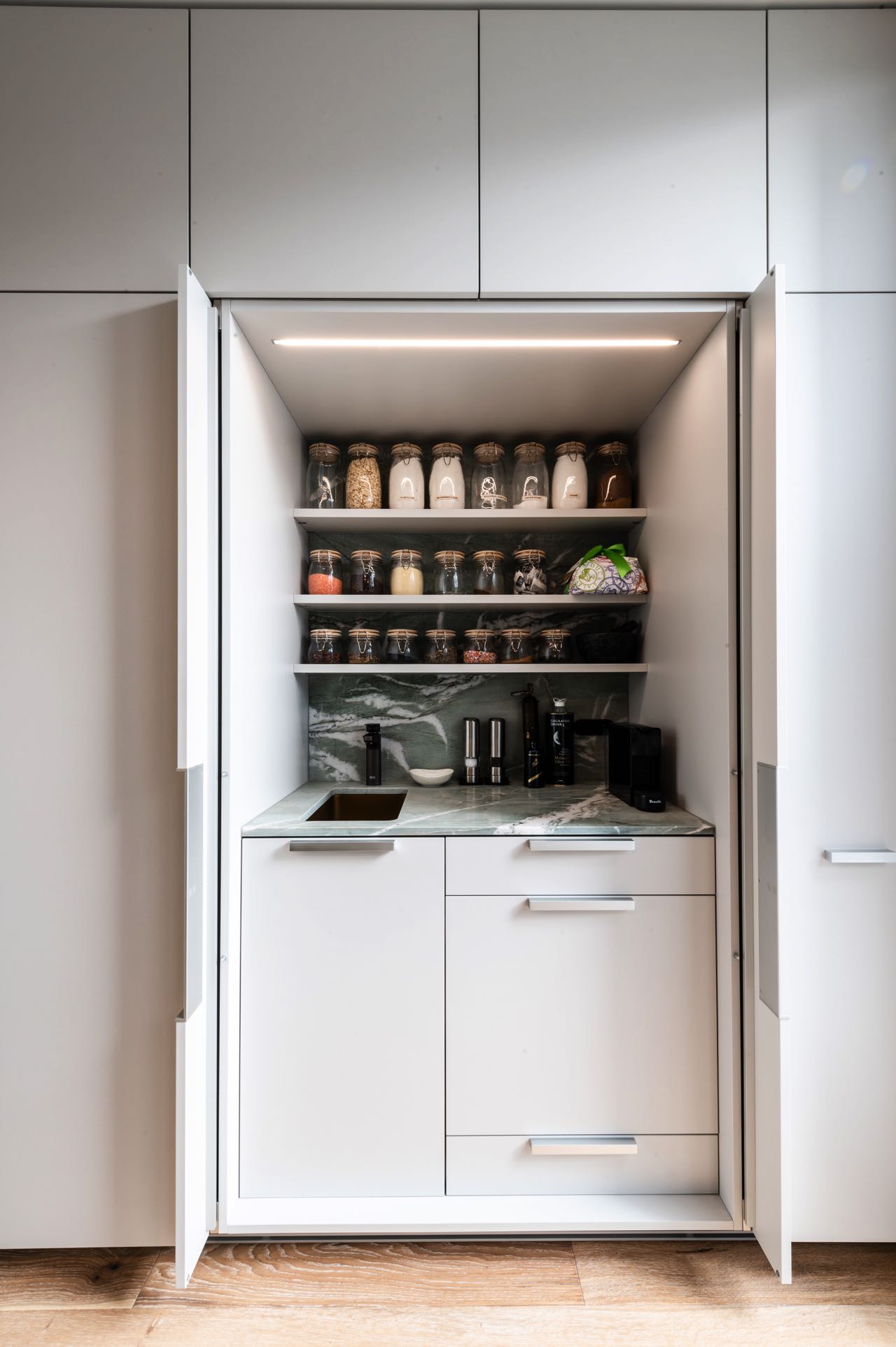 Nur die Tür schließen und schon verschwinden Kaffeemaschine Co Das ist gerade für kleine Küchen praktisch Denn alles wird schnell unsichtbar und ist dennoch sofort griffbereit Die Taschentüren der Themenschränke +Stage von Poggenpohl werden seitlich eingeschoben Das was entsteht ist eine Art funktionale Koje Der Schrank +Stage ist in unterschiedlichen Höhen erhältlich Dabei hat er eine Tiefe von 654 Zentimetern