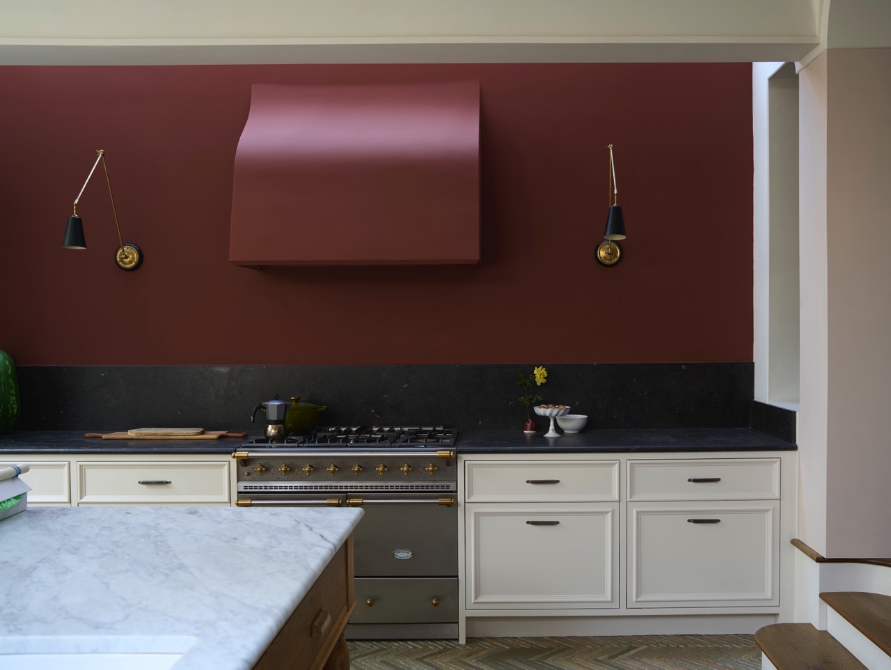 - Eine tolle Idee ist es, eine Wand in einem herbstlichen Farbton zu streichen. Farrow & Ball hält da sehr schöne Nuancen bereit. Hier wurde ebenfalls die Haube und auch Fronten im gleichen Ton gewählt. Das macht den Raum besonders. Der Rotton heißt „Etruscan Red“.