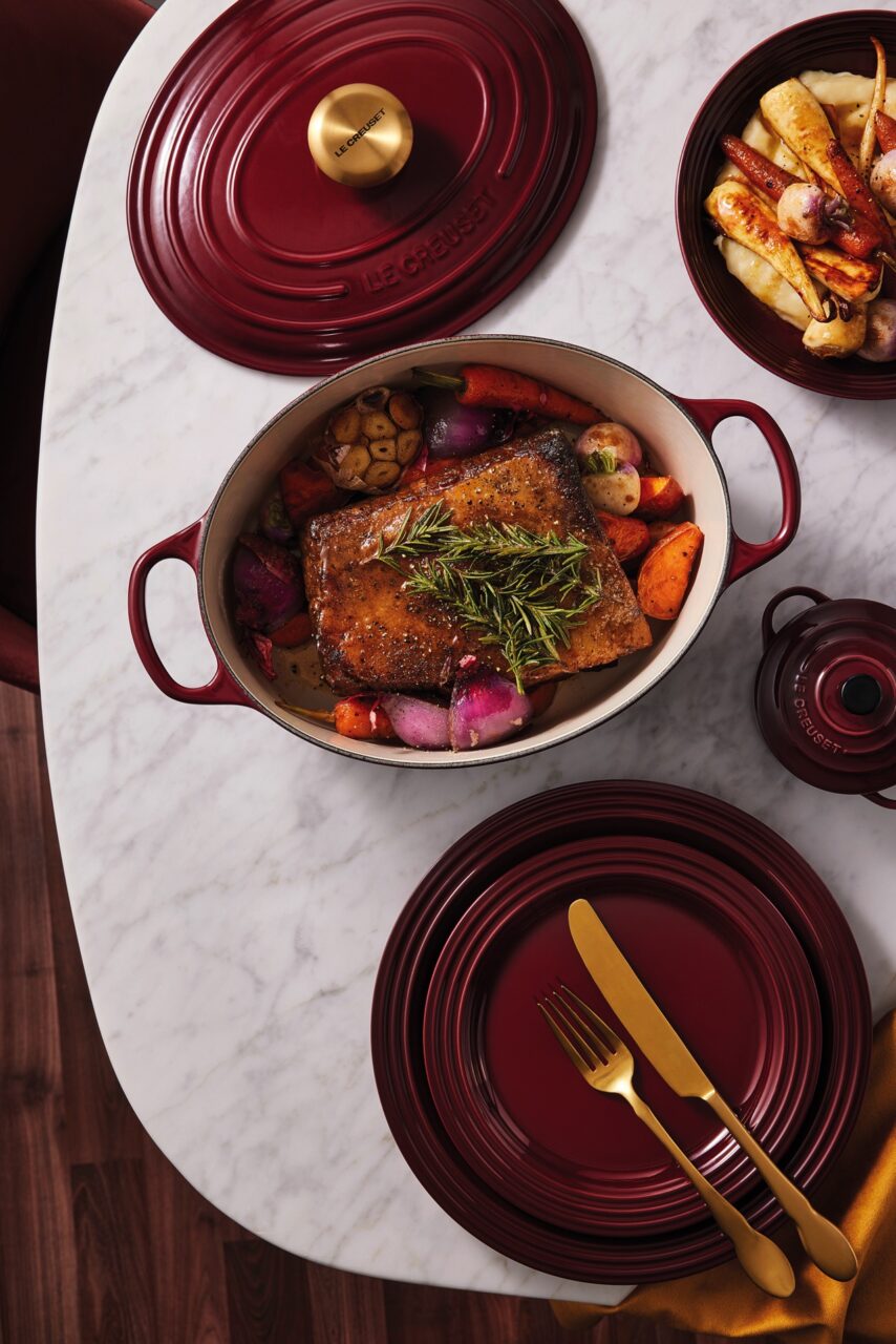 - Der Schmortopf aus emailliertem Gusseisen ist nicht nur perfekt zum Kochen, er macht sich auch gut, um das fertige Essen zu servieren. Alles von Le Creuset.