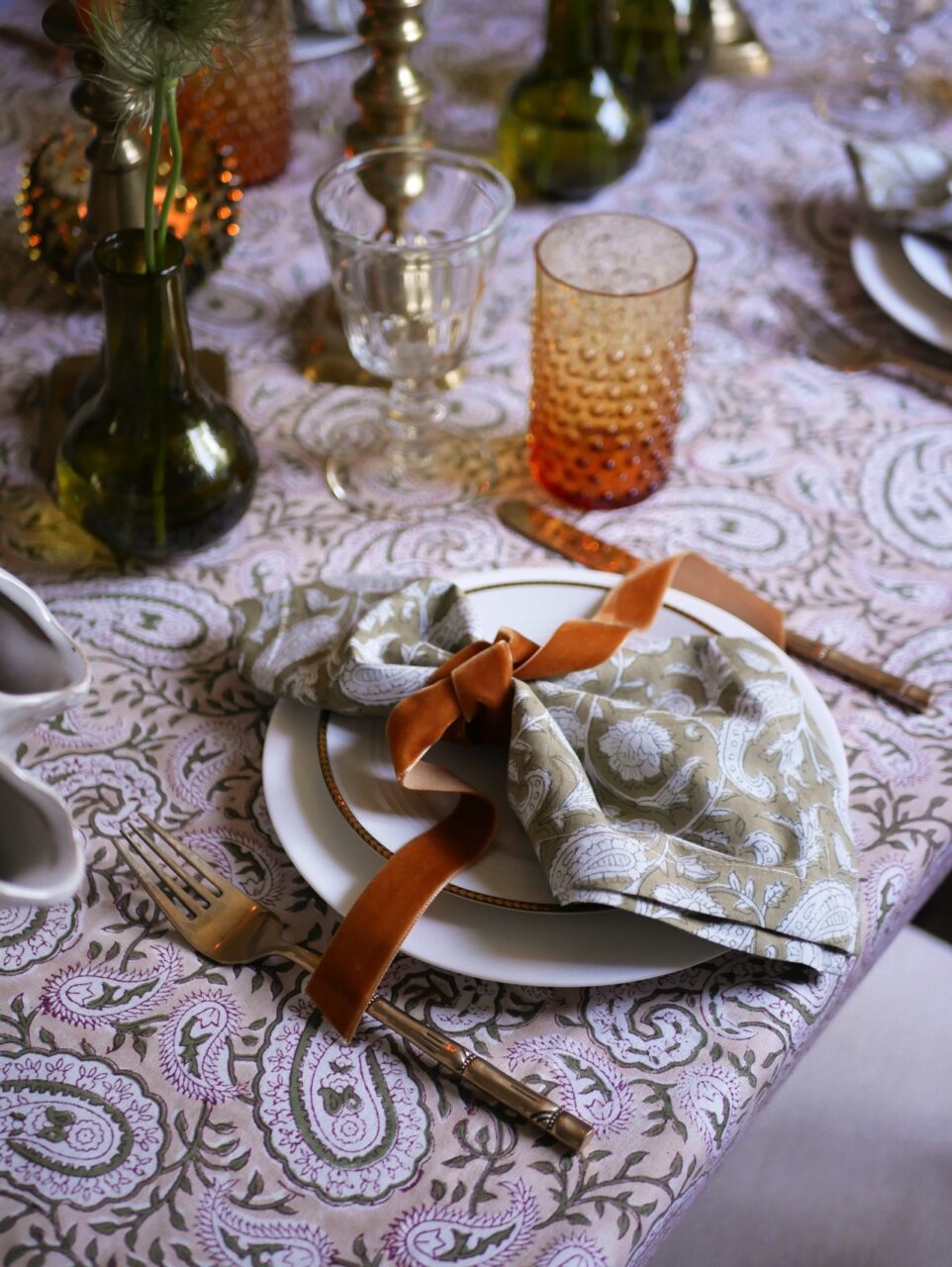- Der Mustermix mit verschiedenen Paisleys, Samt, verspielte Gläser, die Farbe Grün – all das fügt sich zu einem harmonischen Ensemble auf dem Tisch zusammen. Die Ausstrahlung ist warm und elegant zugleich, alles von The Salonette.