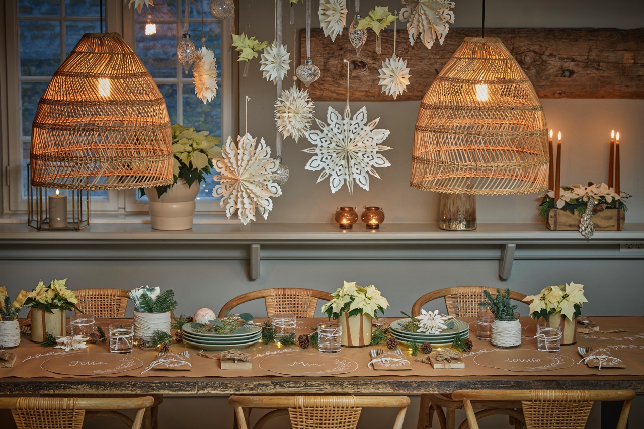 - Über dem Tisch schweben filigrane Papiersterne in Weiß, die für winterliche Leichtigkeit sorgen. Die selbst gestalteten Platzsets sind eine kreative Idee. Frische Weihnachtssterne in zarten Cremetönen sowie kleine Zweige und Zapfen ergänzen den handgemachten Look und machen die Dekoration warm, kreativ und wunderbar persönlich.