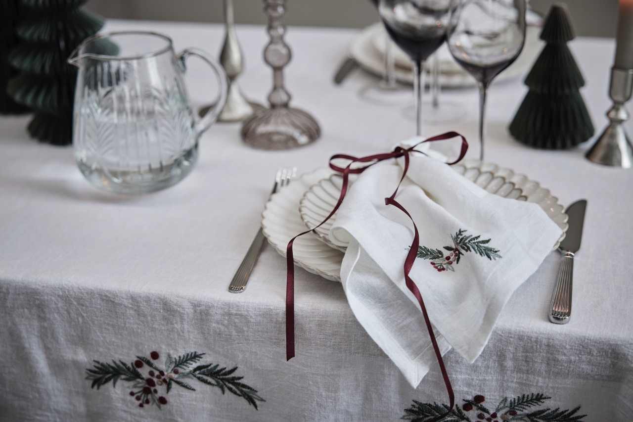 - Niedlich auf dem gedeckten Tisch sind bestickte Servietten, zum Beispiel mit kleinen Zweigen oder Beeren. Sie unterstreicht eine natürliche Deko oder passt als Stilbruch zu eleganten Settings. Alles von Lene Bjerre.
